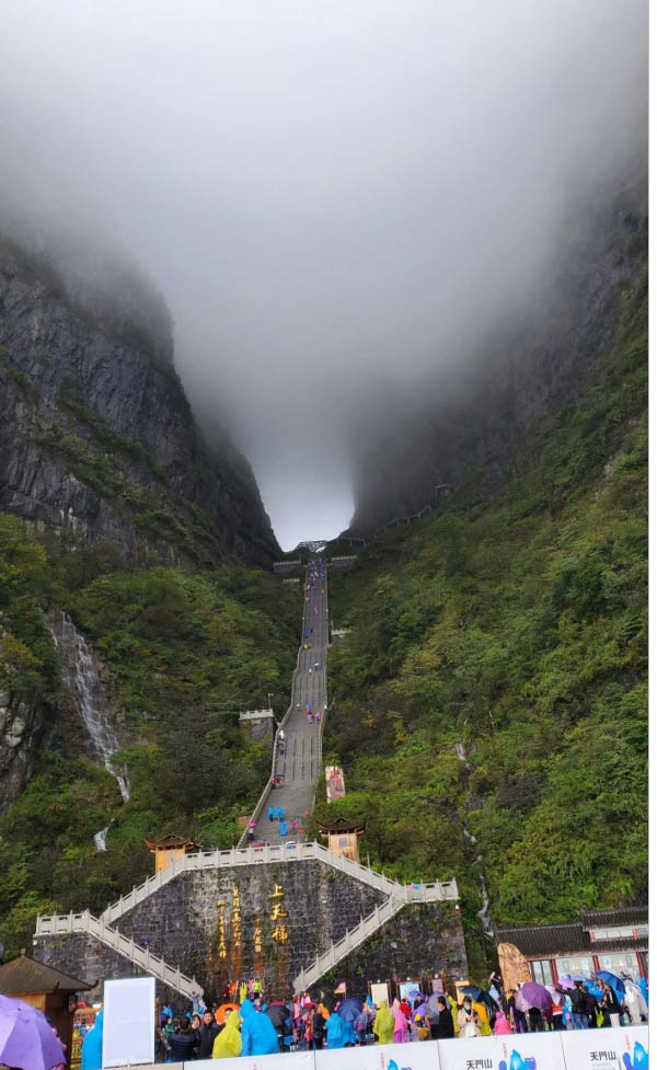 于是在我們又轉(zhuǎn)了7層電梯后,終于來到了天門洞上。依然是白茫茫的一片,天門山棧道,底下原本高聳陡峭的山崖,在白霧的襯托下,一點(diǎn)兒也不讓人覺得害怕了,只是雨天濕滑,內(nèi)心在默默祈禱千萬不要摔倒就好。